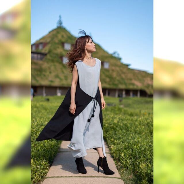 横から前にくる布が歩くたびに揺れて軽快な動きのあるドレスです。