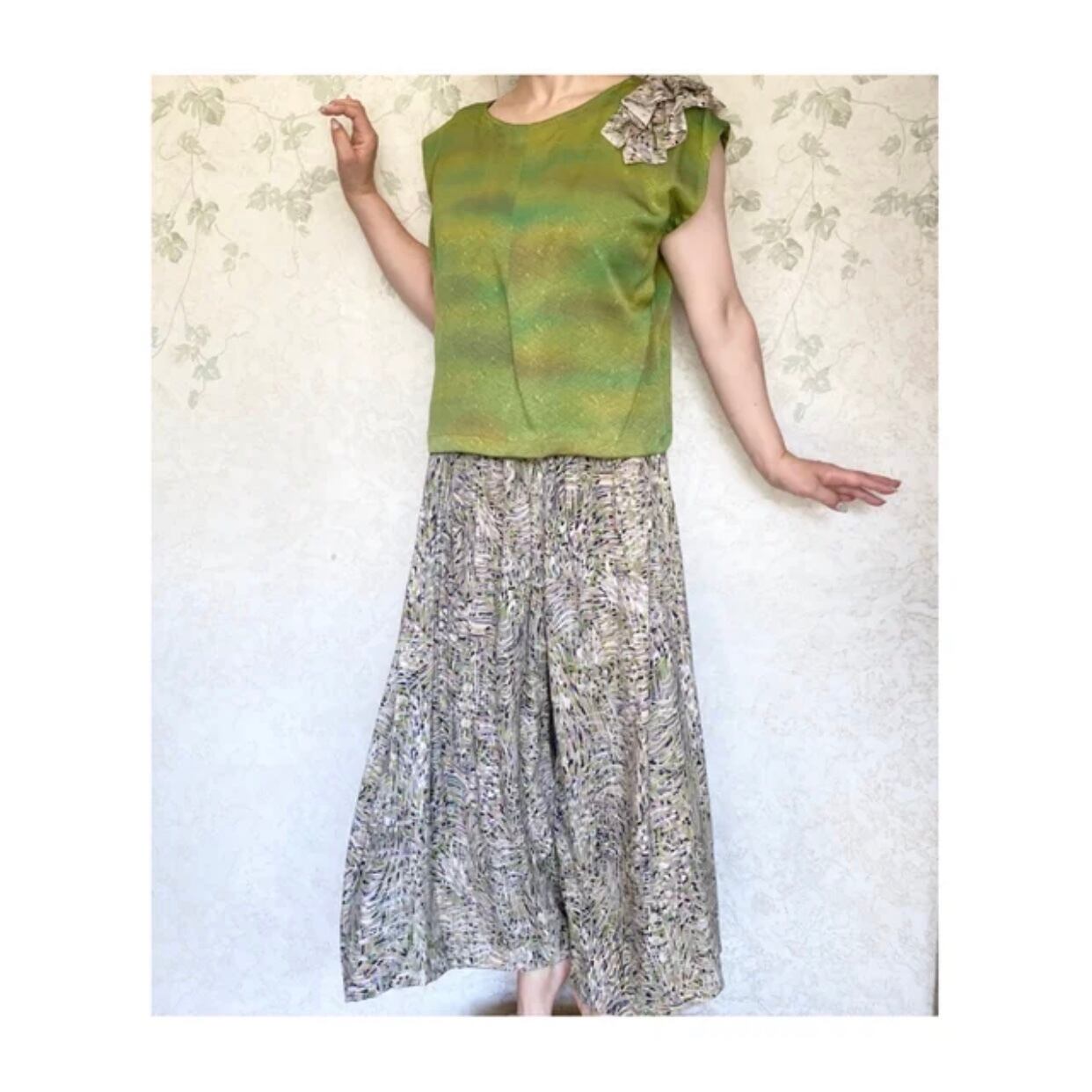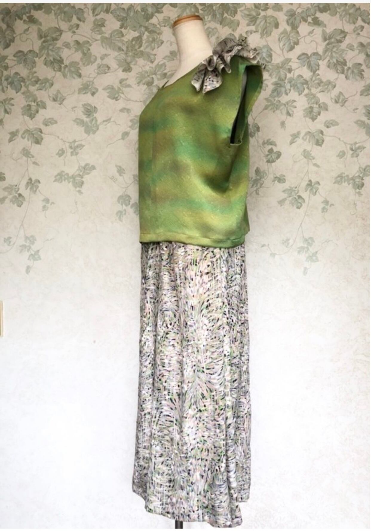 上のブラウスは絹独特の光沢があり地模様とグラデーションの色合いが奥行きをかもしだし華やか、かつ上品に仕上がりました!