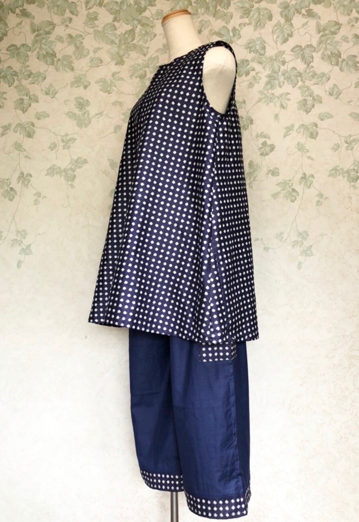 パンツもややワイドタイプで両脇に付けたドット柄のポケットと裾のマチのドット柄が軽やかさと遊び心を楽しんでいただけると思います!