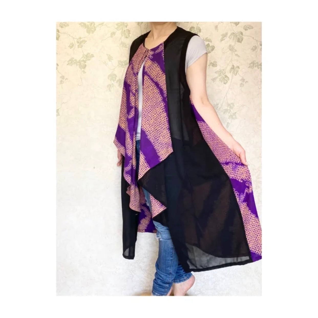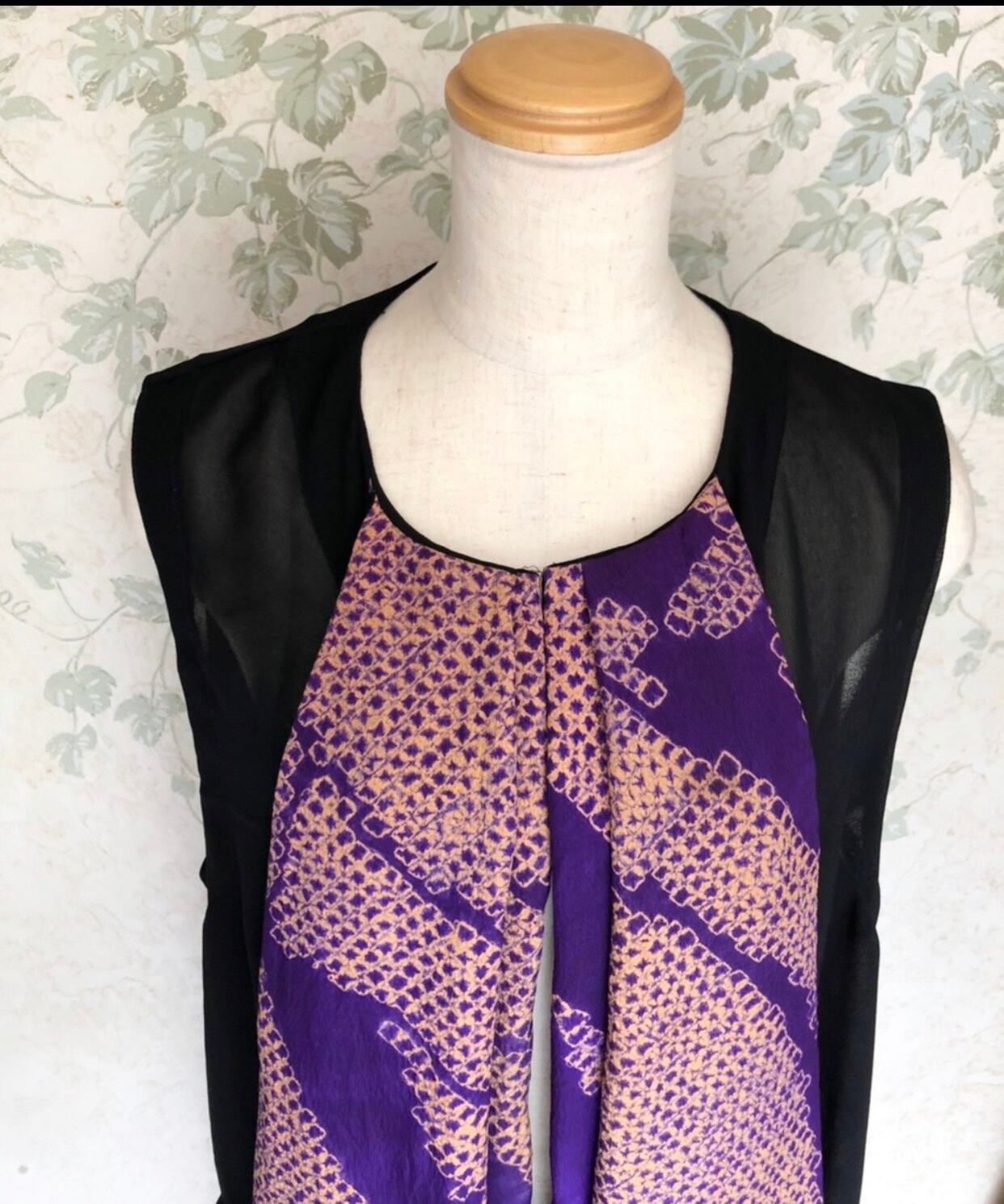 和柄ならではの紫の絞り柄がデザイン性の高いベストとマッチしてとても斬新で素敵です。