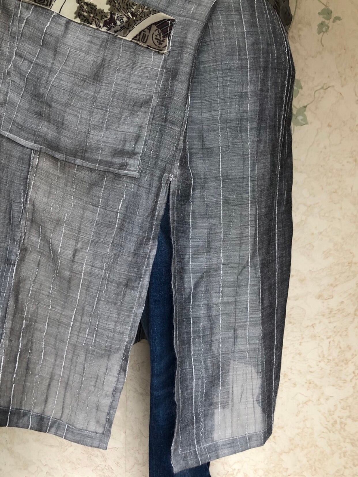 薄手の夏着物を使用しておりますが、シックな色合いですのでベルトとポケットのポイントに古典柄を取り入れました!