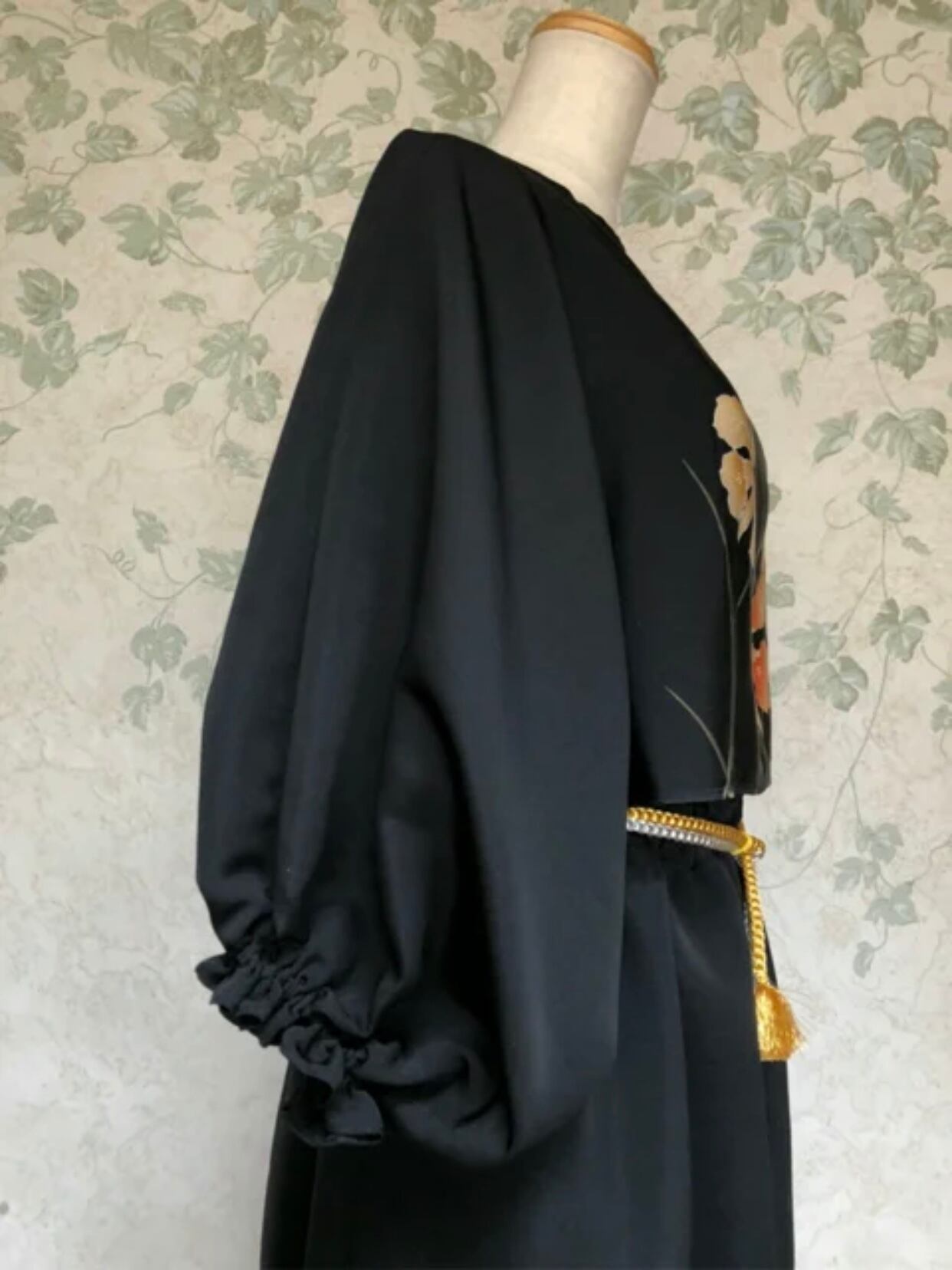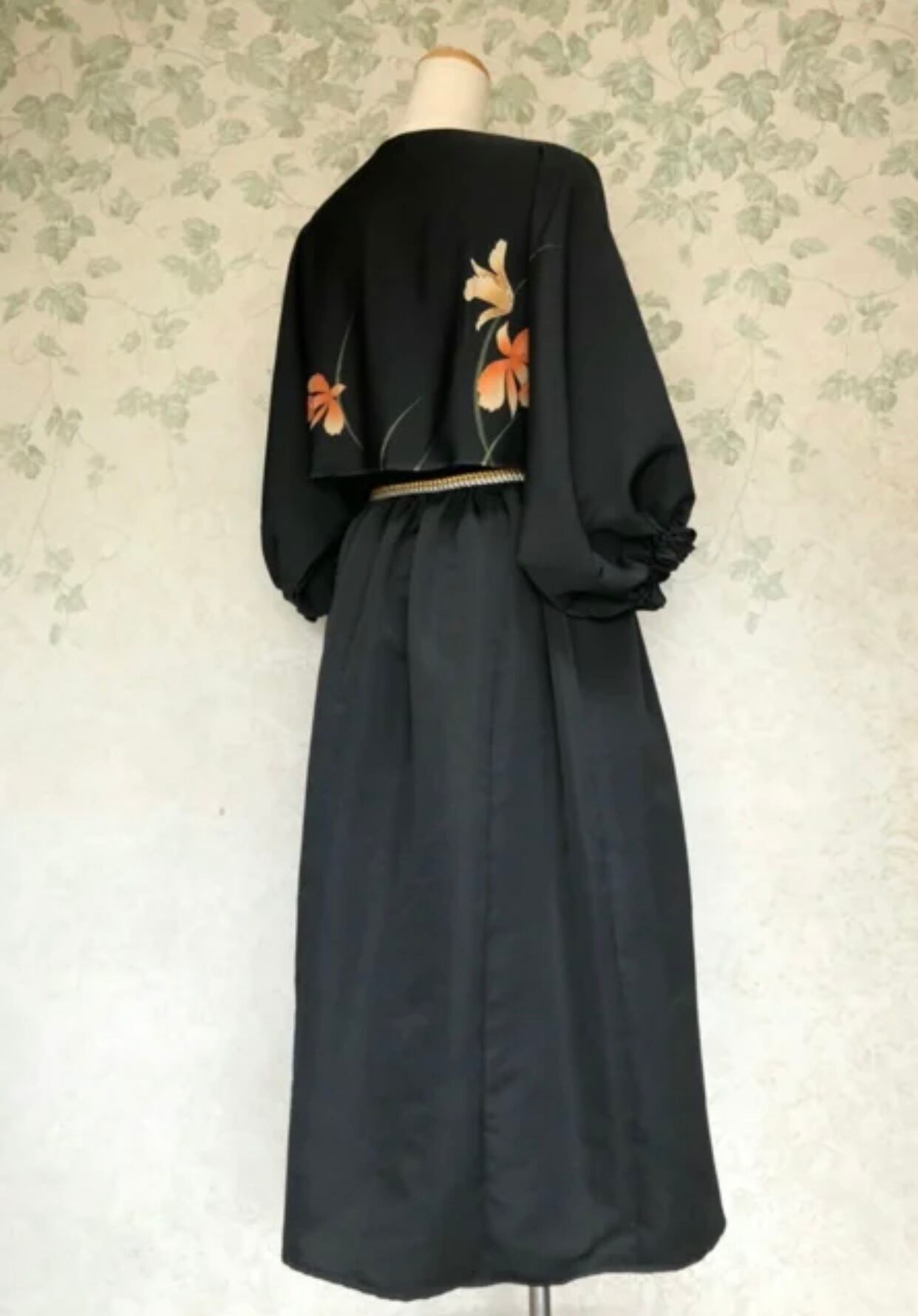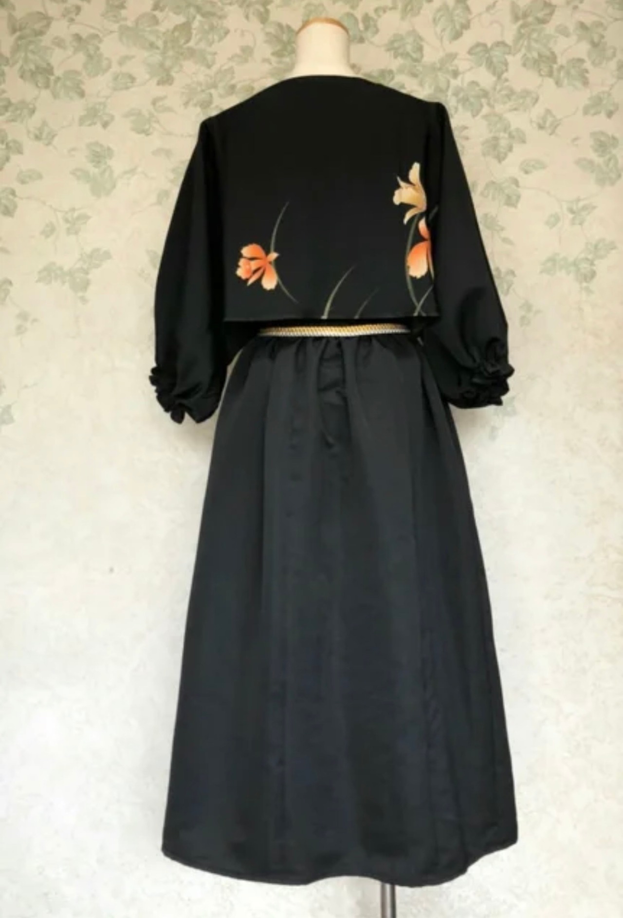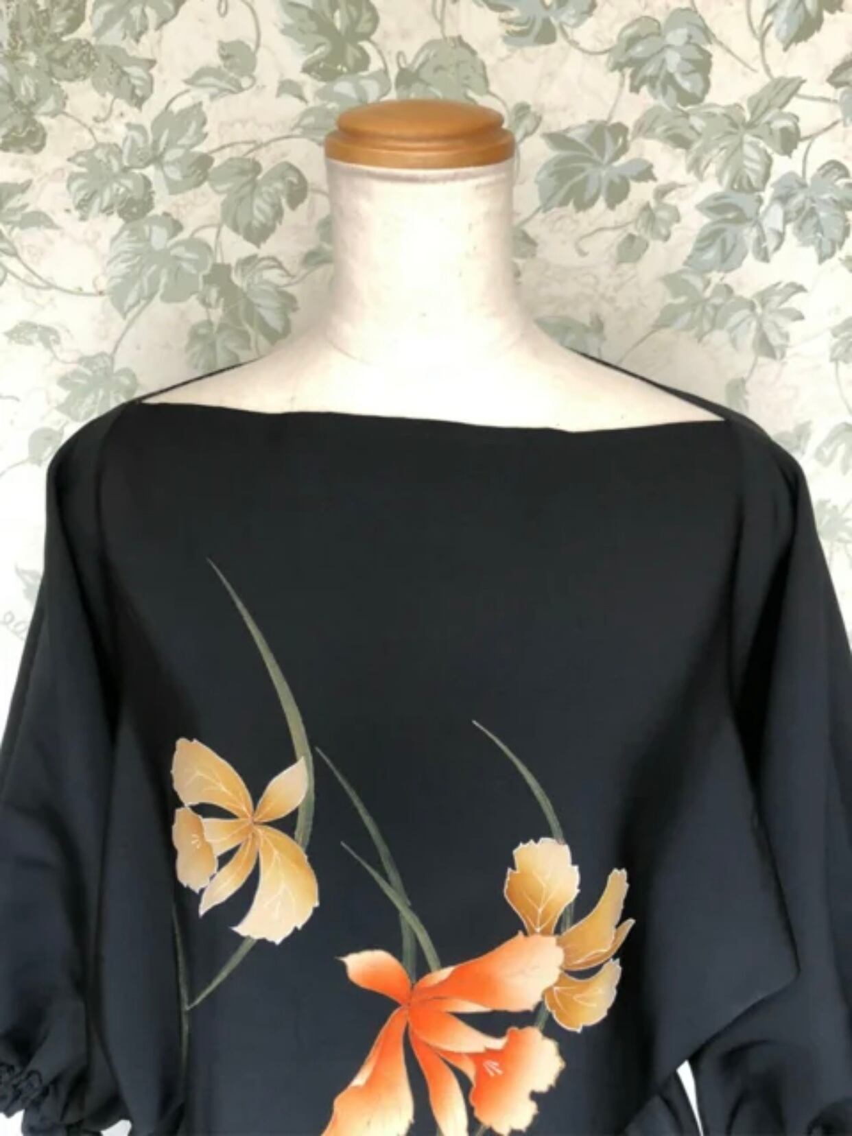 厚手のハリのある黒の着物地にオレンジとゴールドブラウンの美しいお花の模様がなんとも鮮やかなブラウスに