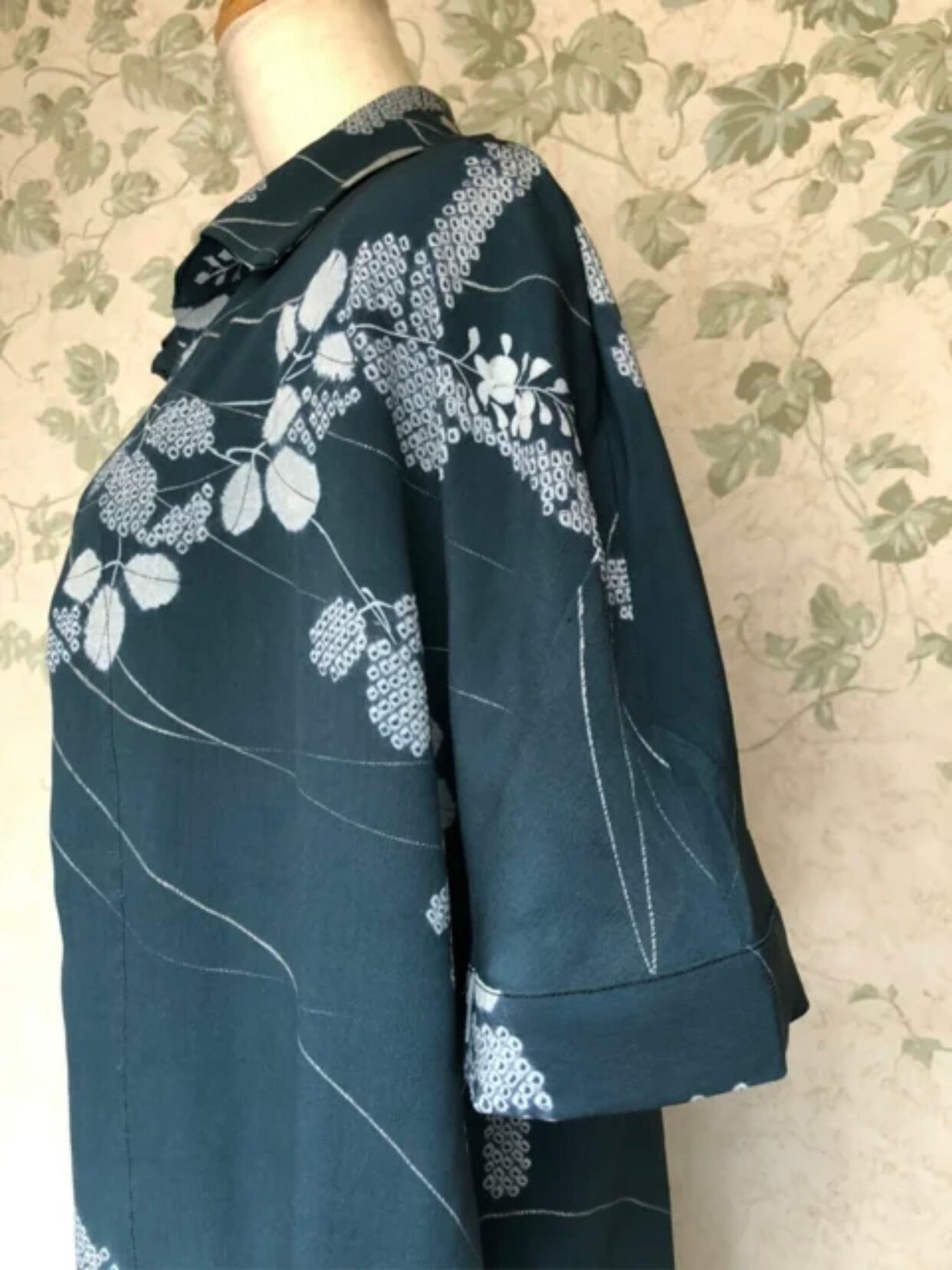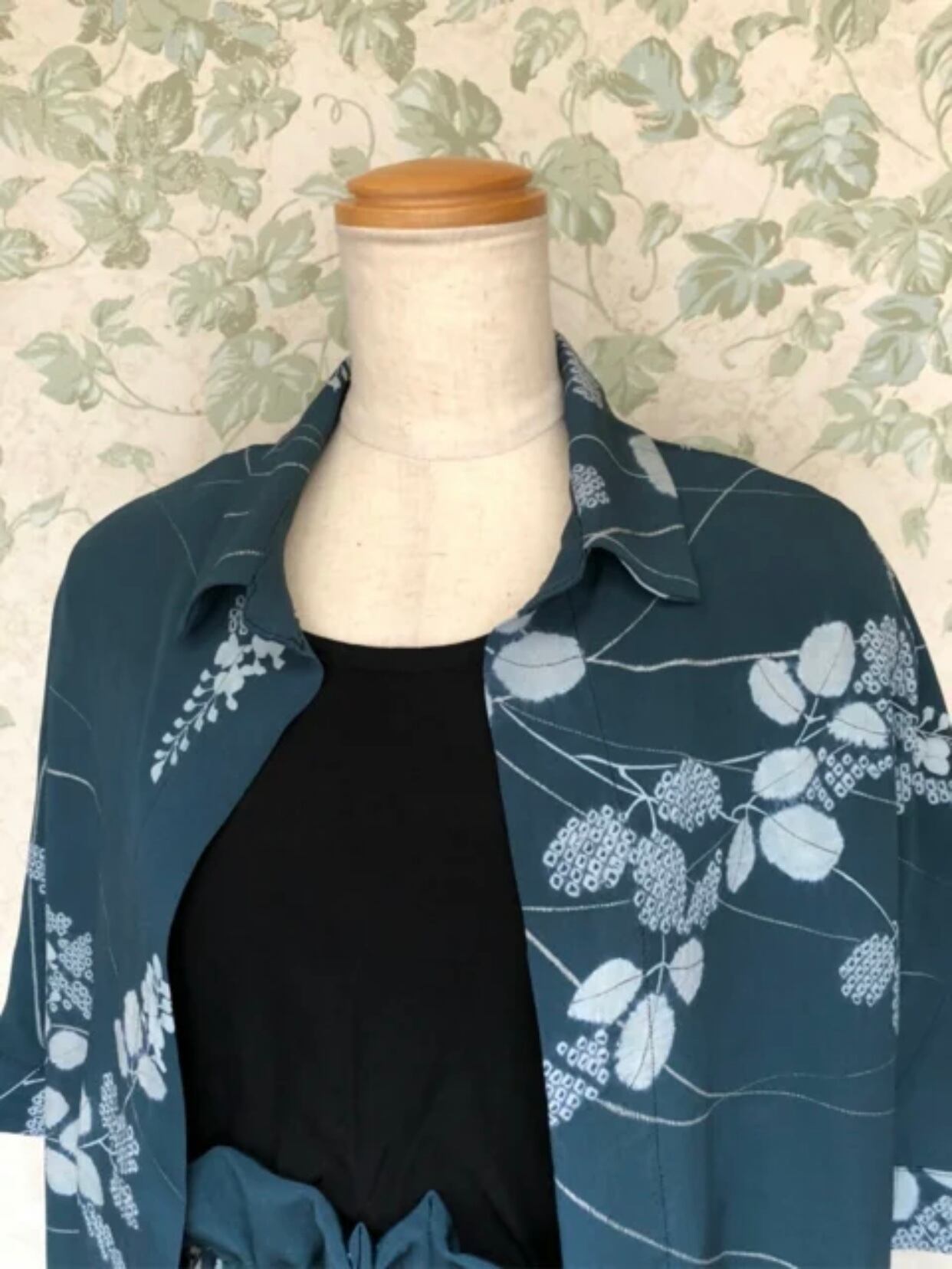 絞り柄の模様が深い緑に映えて落ち着いた着やすい着物リメイクになっております。