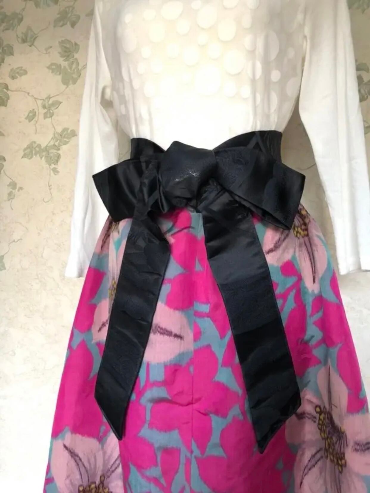 ウエストのリボンはオプションにてご用意させて頂きました帯リメイクのサッシュベルトで、ウエストマークをし、ポイントにしております。