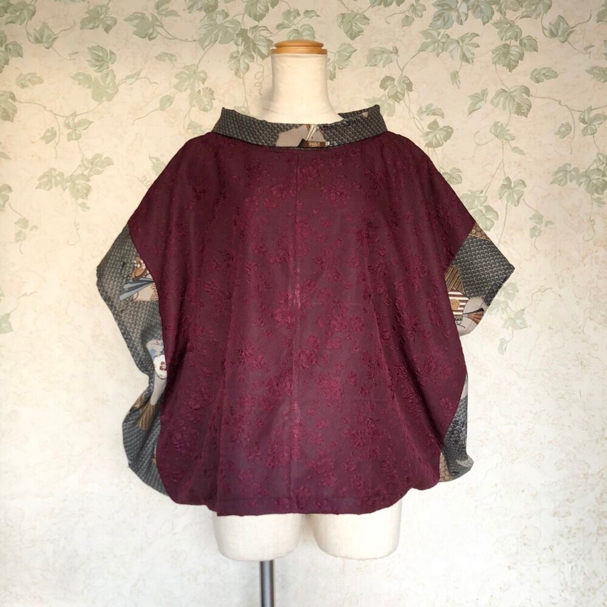 【着物リメイク】2way 和柄アクセント カットソー えんじ色