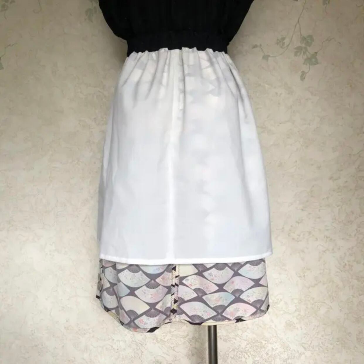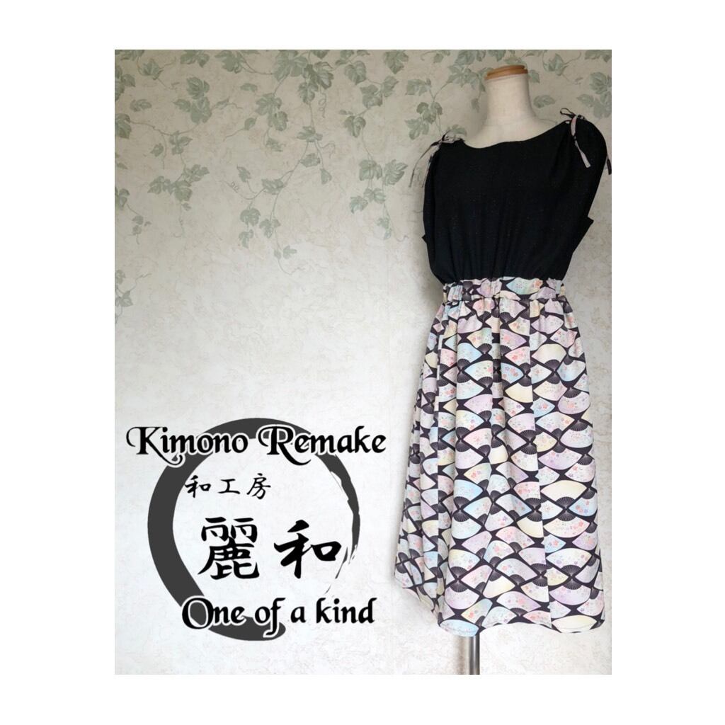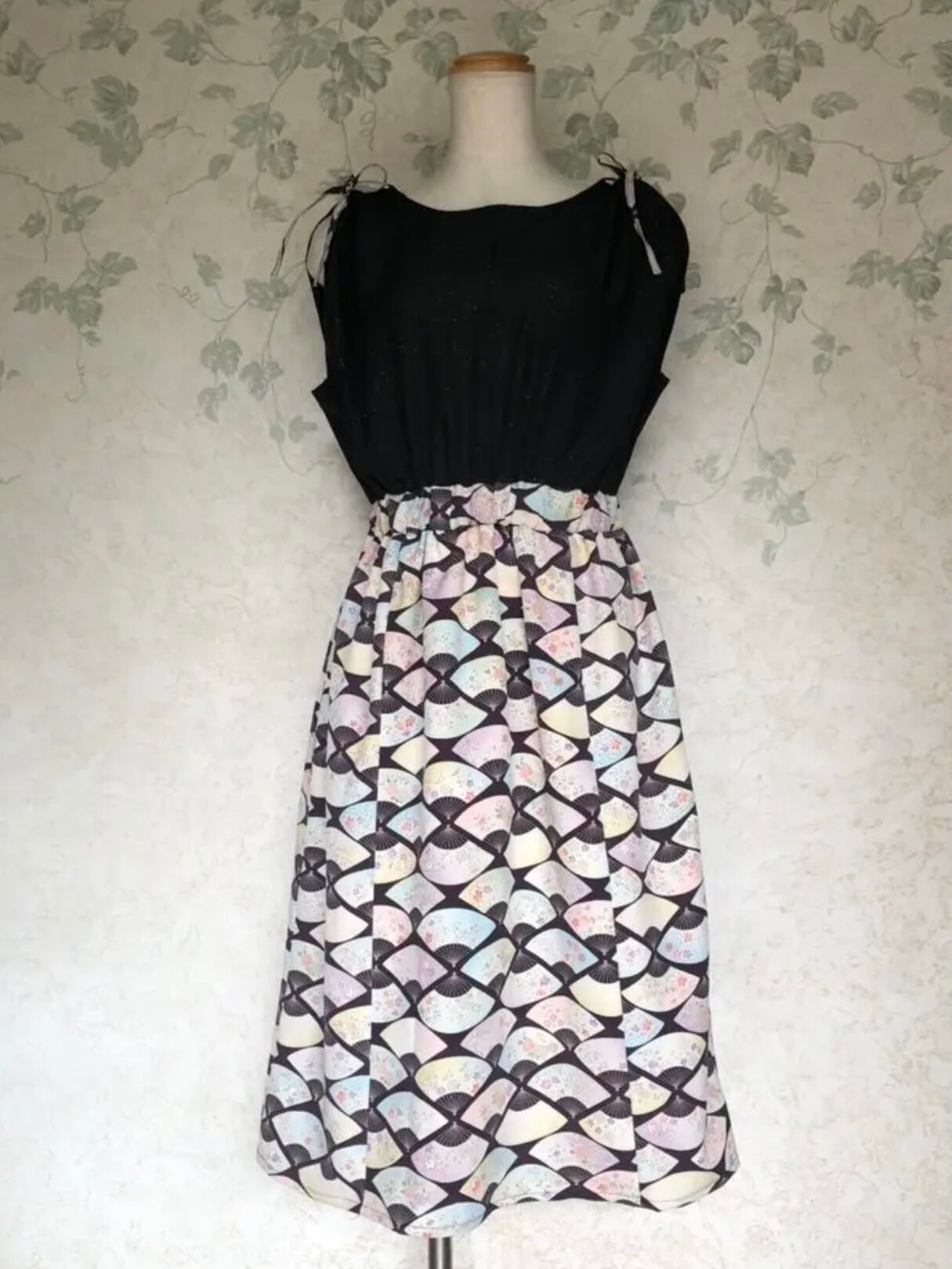 スカートに使用しました着物地は古典的な扇の柄を現代風にアレンジしたような気楽に楽しめる和柄です。