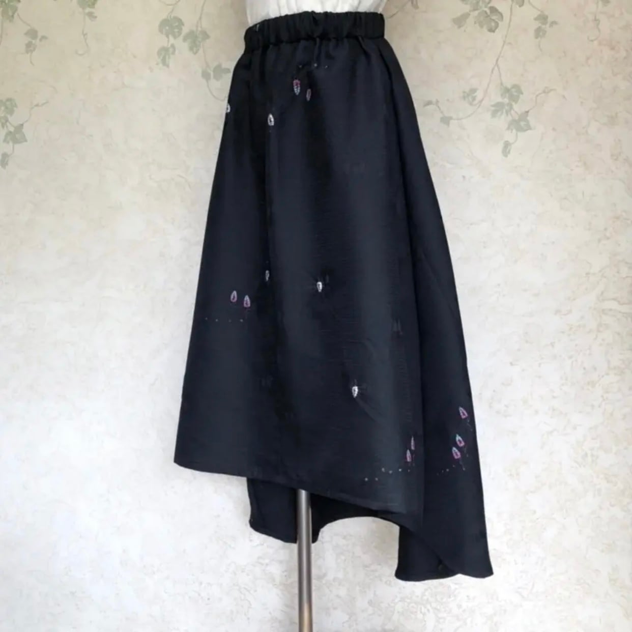 こちらは後ろにかけて裾が長くなっていくアシンメトリーデザインのスカートを着物でリメイク致しました!!!