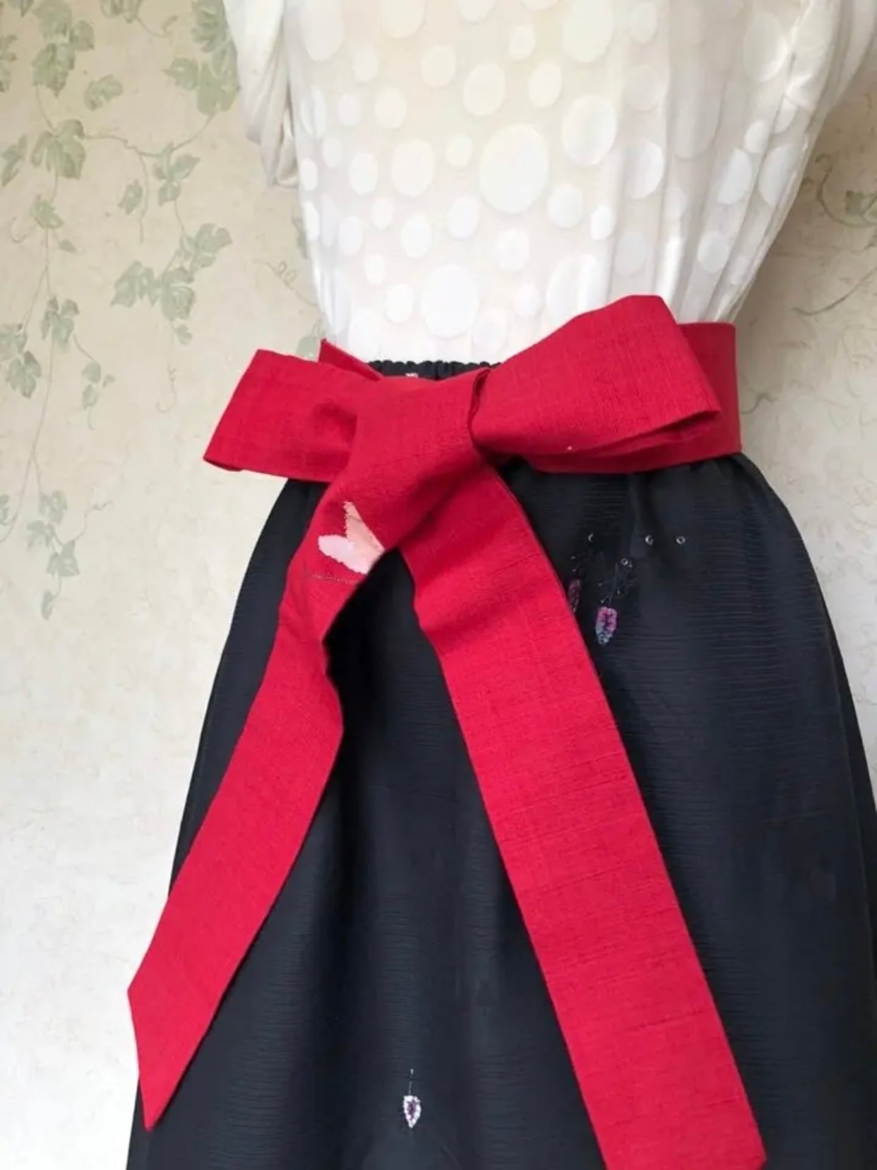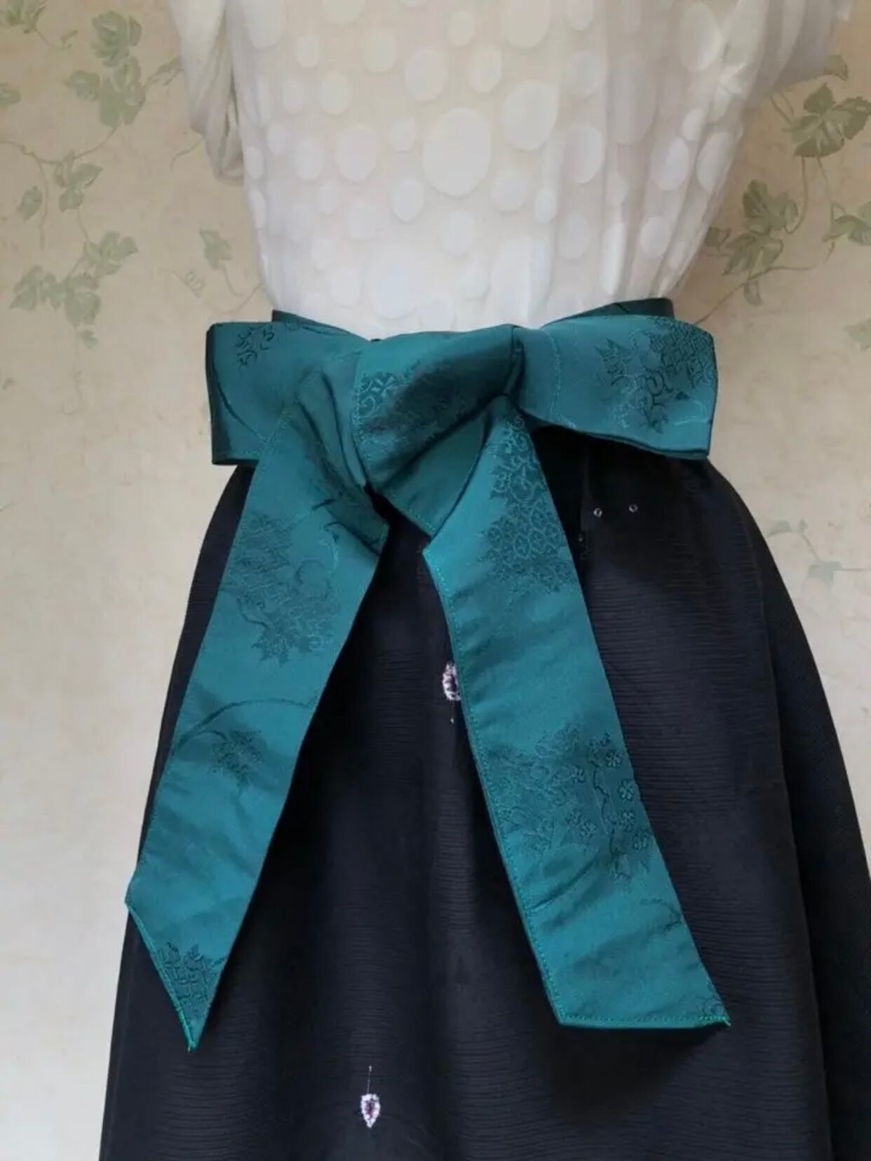 画像のベルトとして使用しておりますのは帯リメイクのサッシュベルトで、このような組み合わせをして頂きますとずいぶん雰囲気が変わってフォーマルにもご使用いただけると思います。