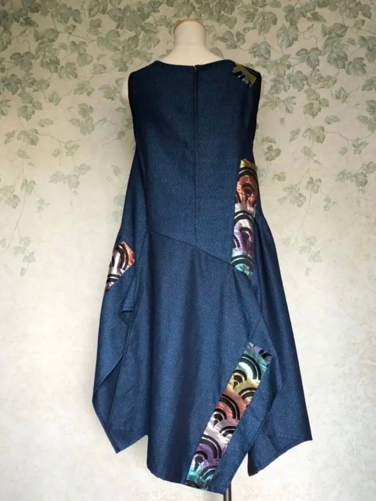 あちこちにレインボーの帯を使いましたが着物とうまく調和して華やかな中にも落ち着きのあるオシャレなワンピースに仕上がりました。