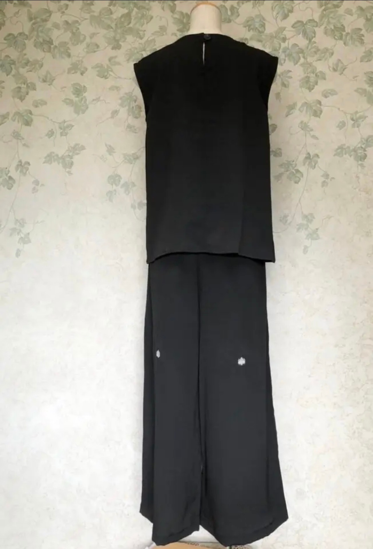 留袖の一番豪華な柄の部分をカーディガンの背中に使用しましたので、カーディガンを羽織ると後ろスタイルは非常に豪華ですがカーディガンを脱いでいただきますと後ろスタイルは上品な黒のパンツスーツになっております。