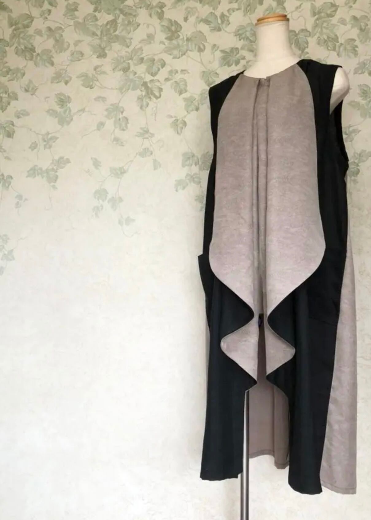 上質な光沢のあるシルクのお着物と夏の絽のお着物を合わせてドレープの綺麗なベストを着物リメイク致しました。
