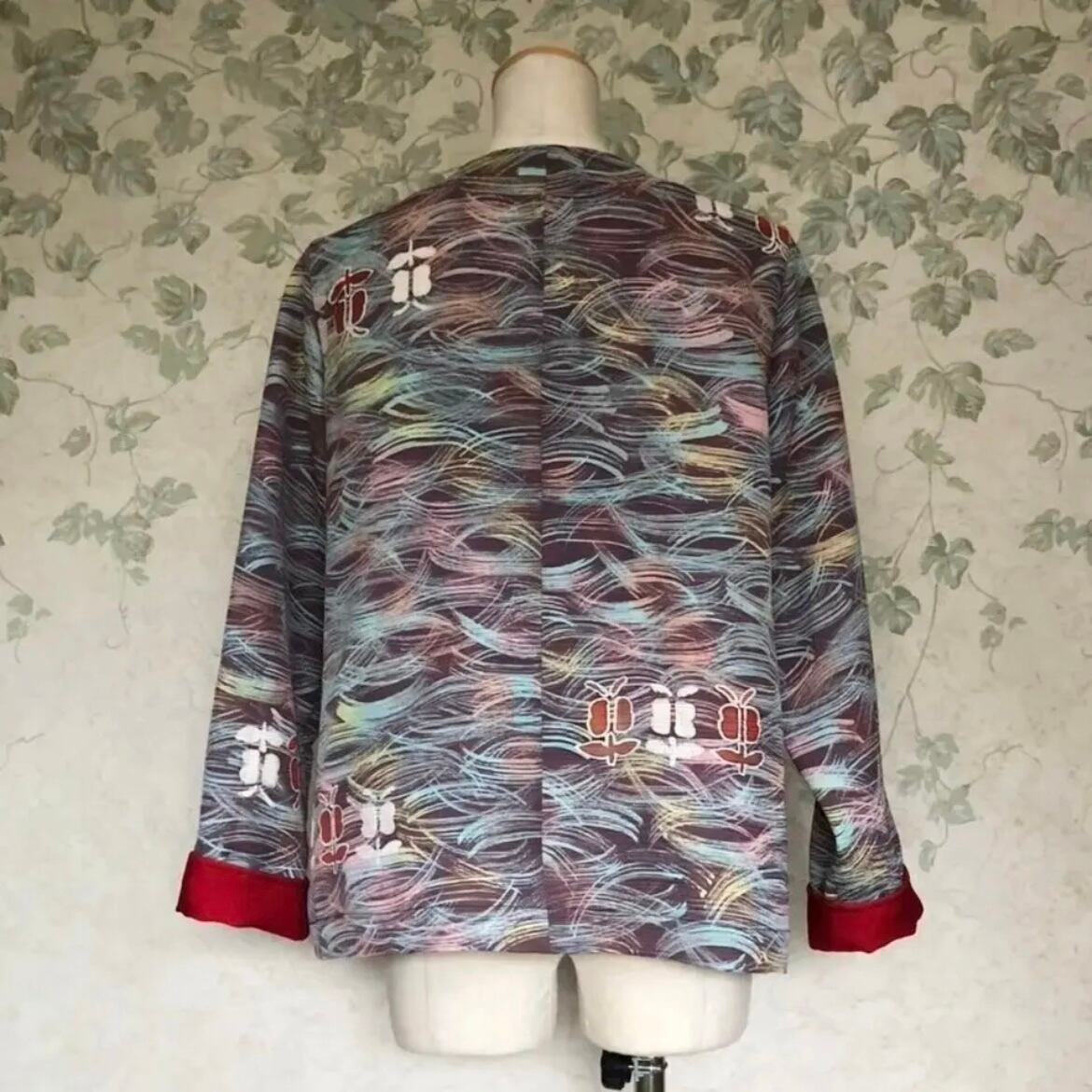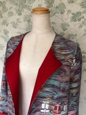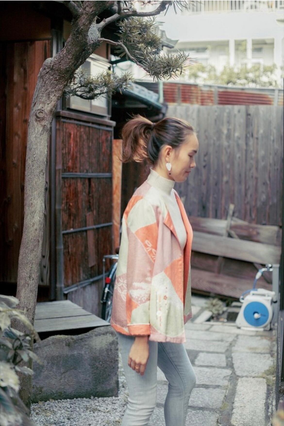 和柄の中でも個性的で粋な着物地を使用し季節などを気にせず合わせやすいジャケットに仕上がりました。