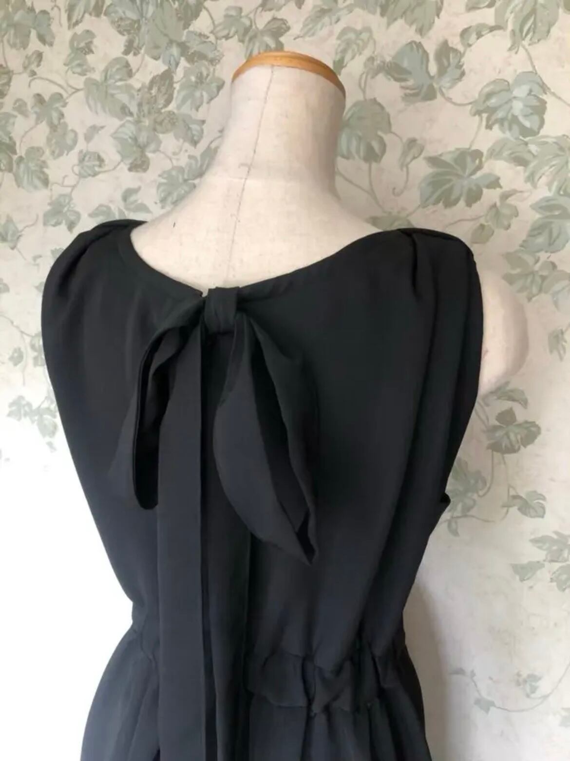 後ろ姿は長めに作ったリボンがアクセントになった黒のワンピースですが、前は裾全面に花柄があり、その花びらの中に光沢のある糸で刺繍してあるのがあります。