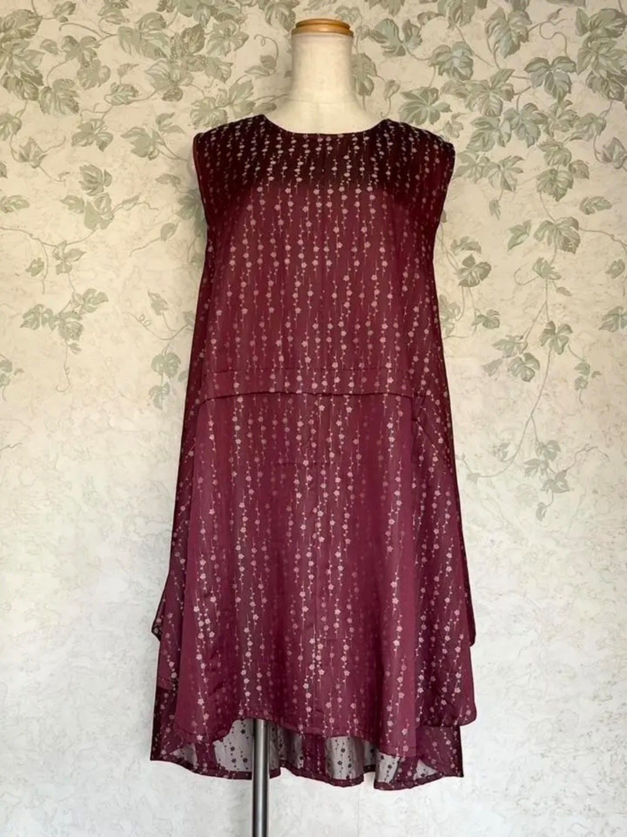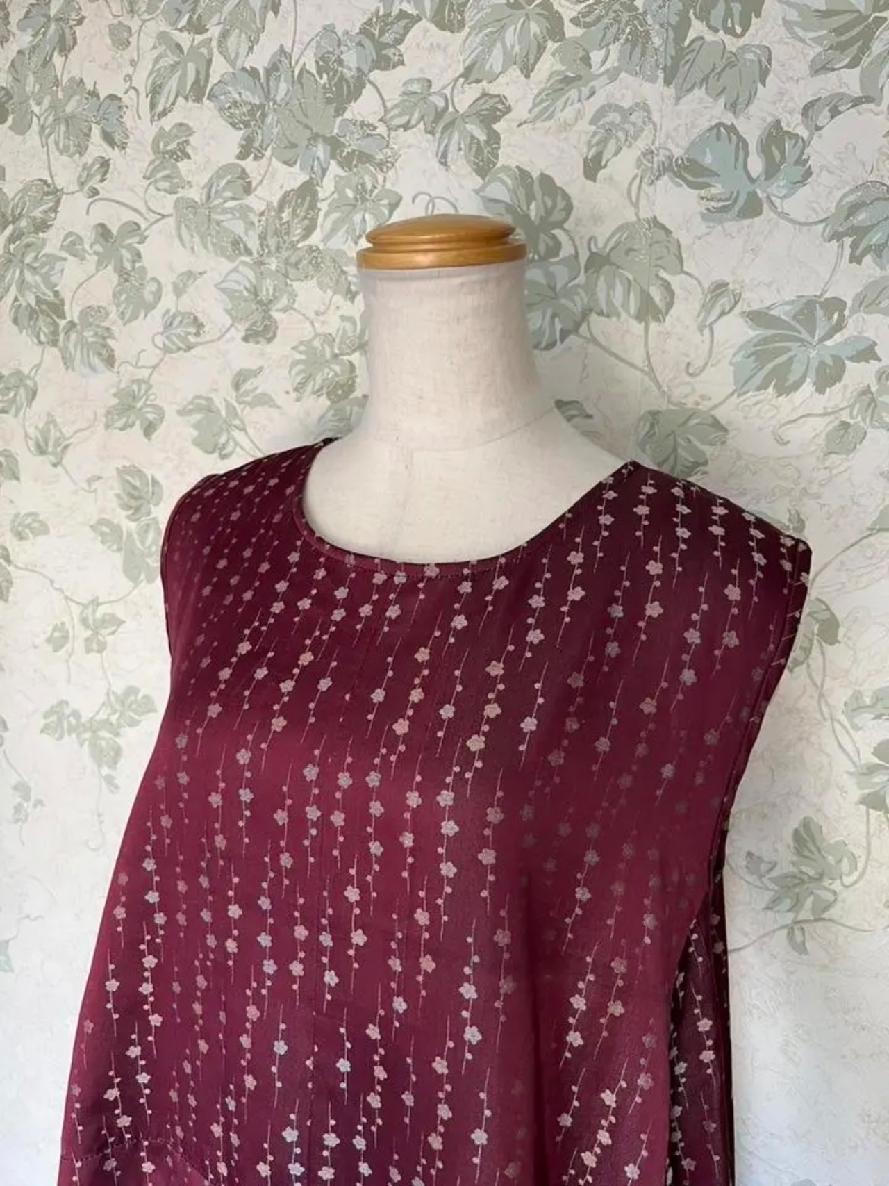 赤紫色の地に白い小花が浮き出ていて角度によって動きが感じられるお着物でサーキュラーチュニックをお作りいたしました。